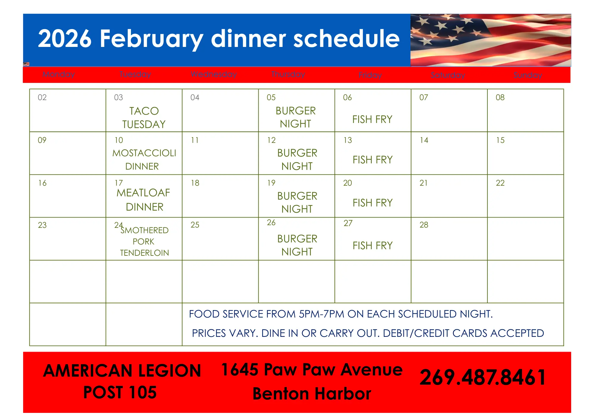 We’ve got the eats! Join us Tuesdays, Thursdays and Fridays for a warm, hearty evening of fantastic foods and good company. Whether you dine in or grab a carry-out, it’s a perfect evening to share a meal, meet friendly faces, and support your local Legion. We’ll see you at Post 105…bring your appetite!”