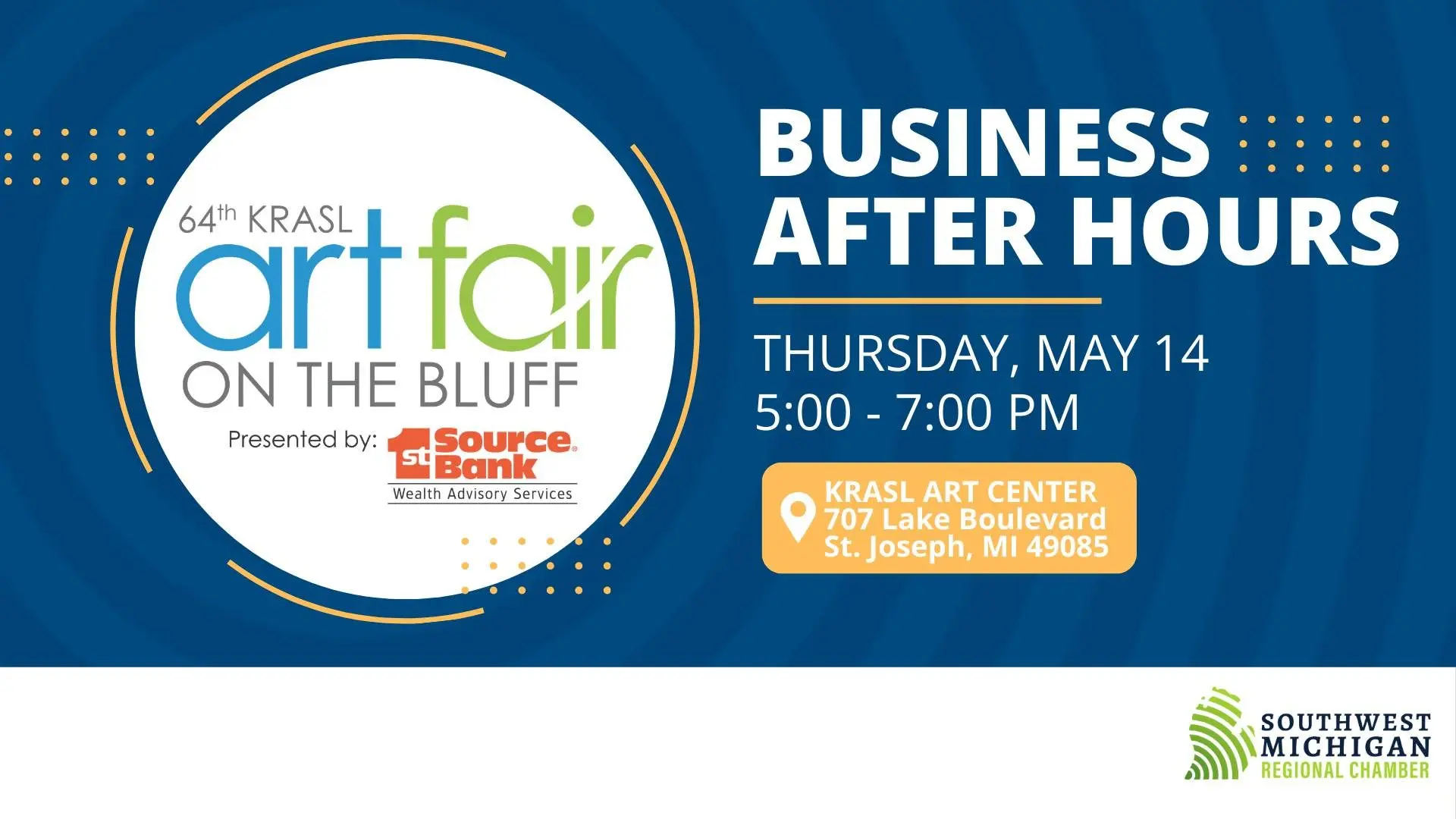 Be among the first to discover the 2026 Krasl Art Fair plans at May’s Business After Hours. The Southwest Michigan Regional Chamber and KAC will host the event on Thursday, May 14, 2026, from 5 – 7 pm. Come for drinks, light snacks, and networking.