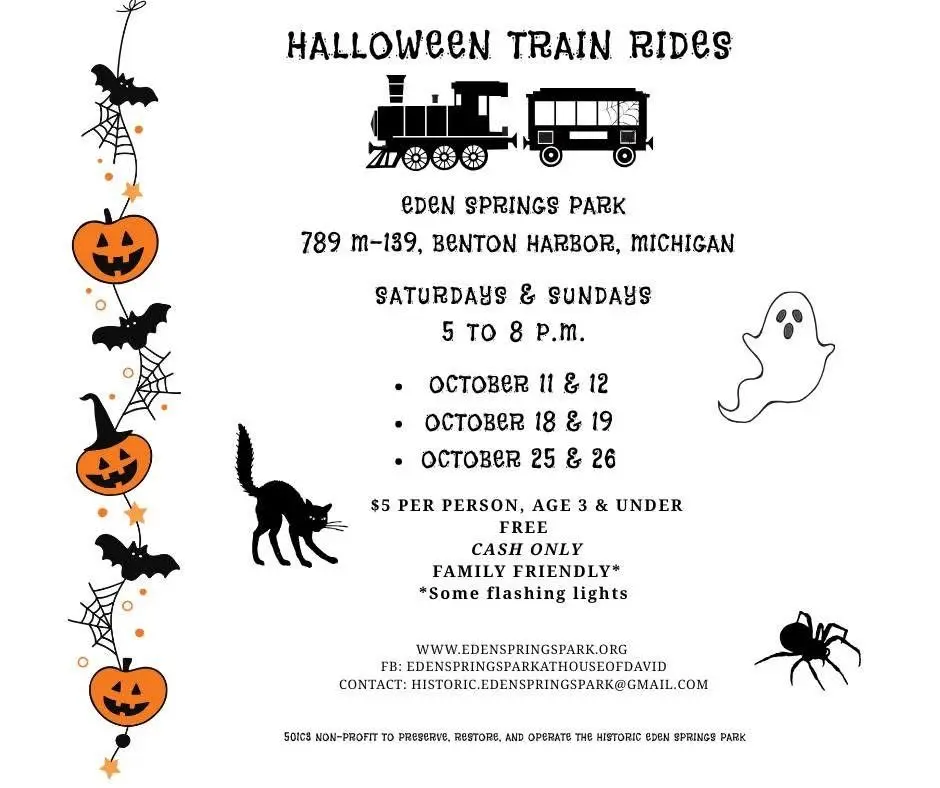 Come enjoy the evening ride and see our Spooky decorations. Halloween themed miniature train rides in our historic amusement park. Ride and decorations are kid friendly. Bring the family and enjoy the holiday ride! Details on flyer.