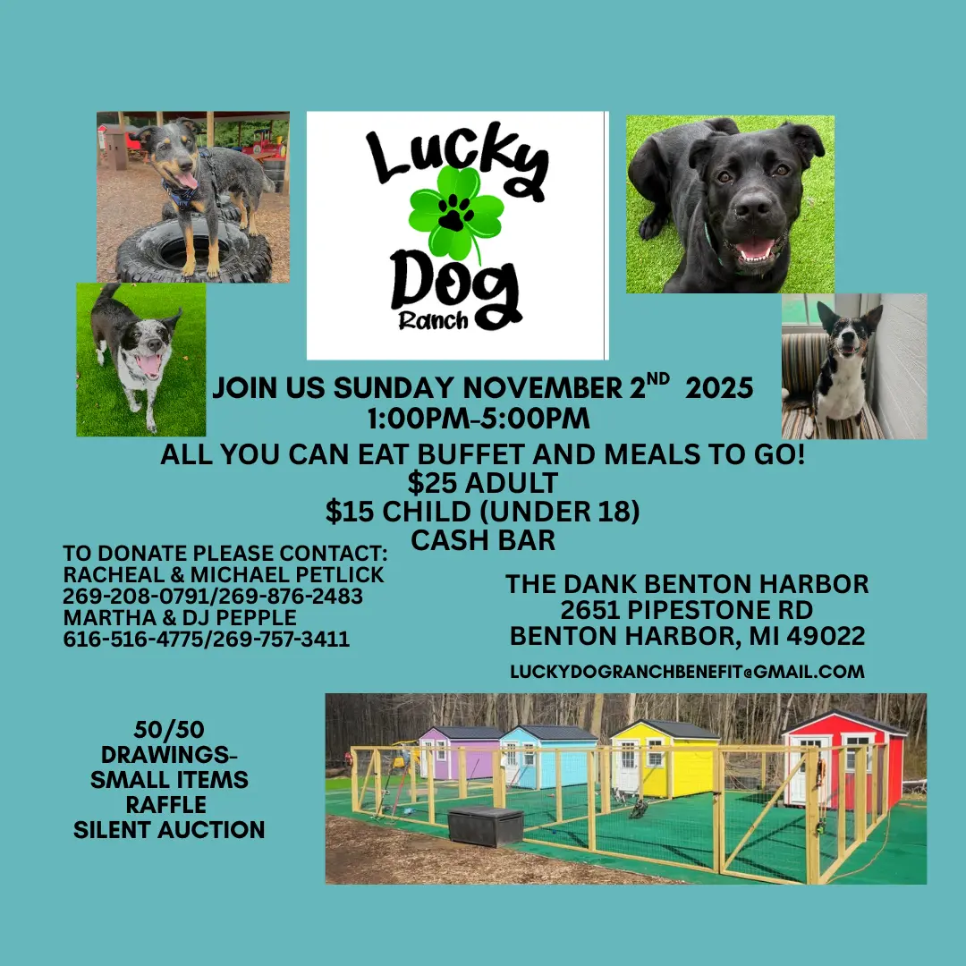 November 2nd at The Dank of Benton Harbor Lucky Dog Ranch is hosting a fundraiser to help raise funds for the newest nonprofit dog rescue in Benton Harbor. All you can eat buffet for $25/adult and $15/child. Raffles and Silent auctions!