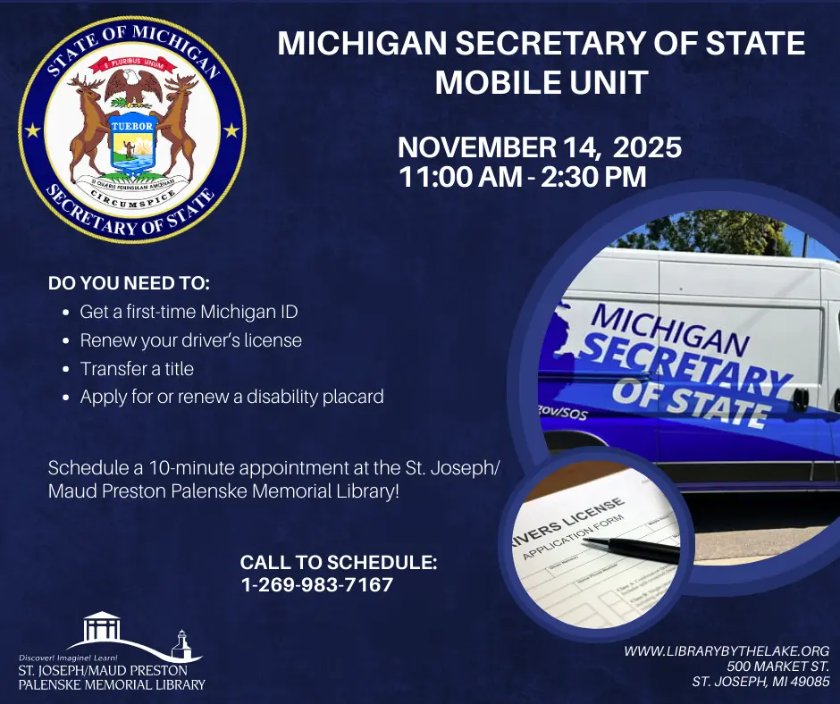Need to get to the Secretary of State Office but worry about the lines? Schedule an appointment here at the library! For 1 day, the Mobile Secretary of State unit will be with us to help folks get licenses renewed, get a first-time Michigan ID, transfer a title, and apply for or renew disability placards. Usual payments to the Secretary of State will apply.