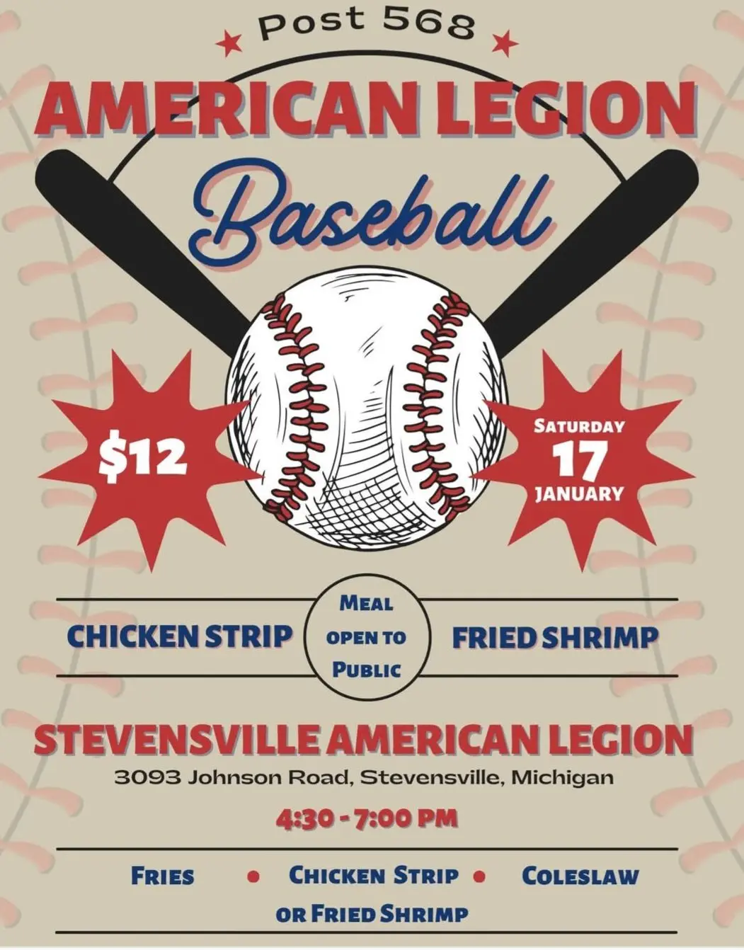 Stevensville Post 568 Baseball is hosting a Chicken and Shrimp Dinner, public welcome. Get a 7 piece fried shrimp or 3 piece chicken tender dinner with fries and cole slaw for $12. Eat in or to go available.