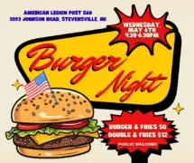 STEVENSVILLE AMERICAN LEGION POST 568 BURGER NIGHT BURGER & FRIES $8 DOUBLE & FRIES $12... ...Read Full Story