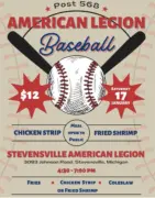 Stevensville Post 568 Baseball is hosting a Chicken and Shrimp Dinner, public welcome. Get a 7 piece fried shrimp or 3 piece chicken tender dinner with fries and cole slaw for $12. Eat in or to go available. ... ...Read Full Story